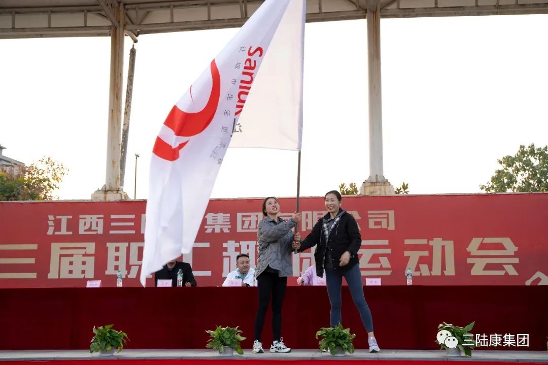 本屆運(yùn)動(dòng)會(huì)承辦單位江西君健實(shí)業(yè)有限公司總經(jīng)理曹敘婷女士,將運(yùn)動(dòng)會(huì)會(huì)旗移交至下一屆承辦方新能源事業(yè)部,由總經(jīng)理助理唐舟女士接受會(huì)旗。